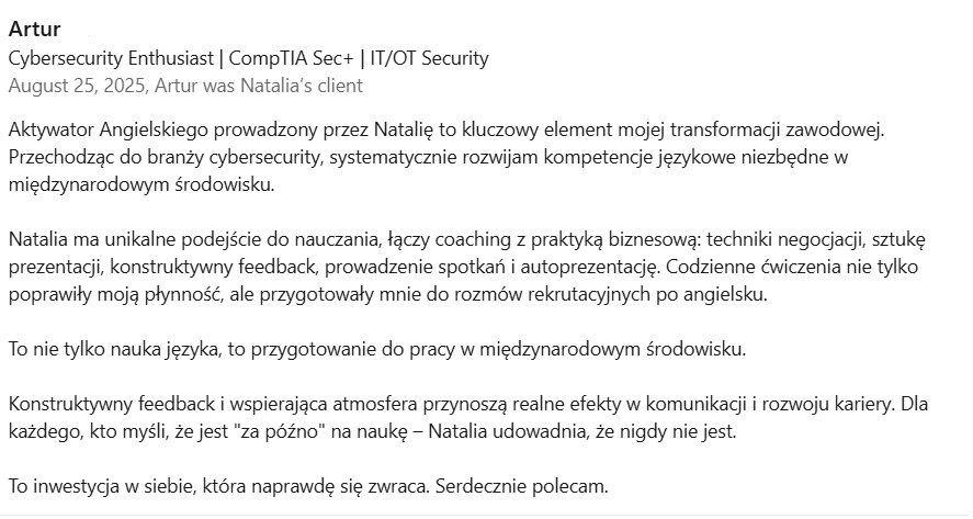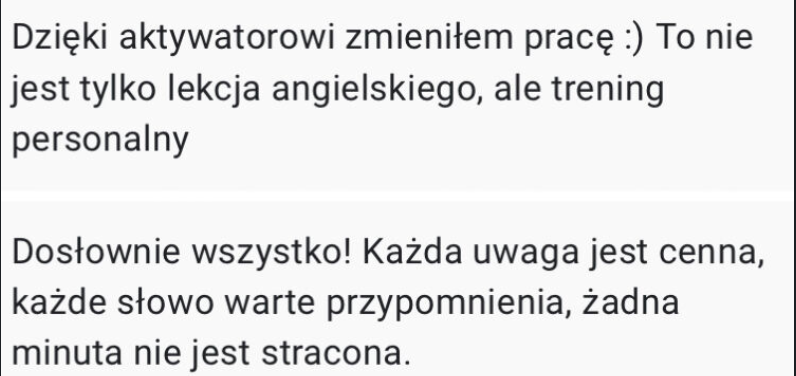 Zaufaj mi, a razem osiągniemy Twoje cele językowe szybciej, niż myślisz. Dołącz do Aktywatora Angielskiego i zobacz, jak zmienia się Twoje życie dzięki płynności i pewności siebie w języku angielskim.