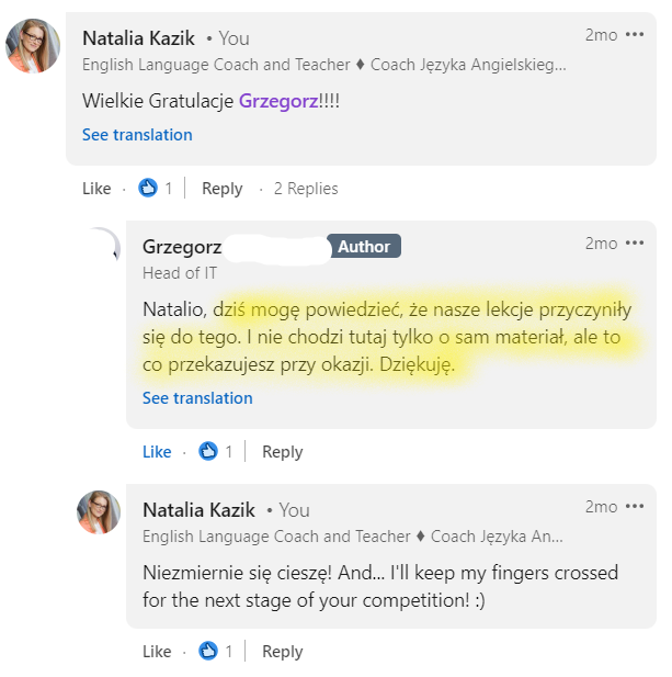 - Podczas tych spotkań, otrzymujesz ode mnie feedback i wskazówki językowe.