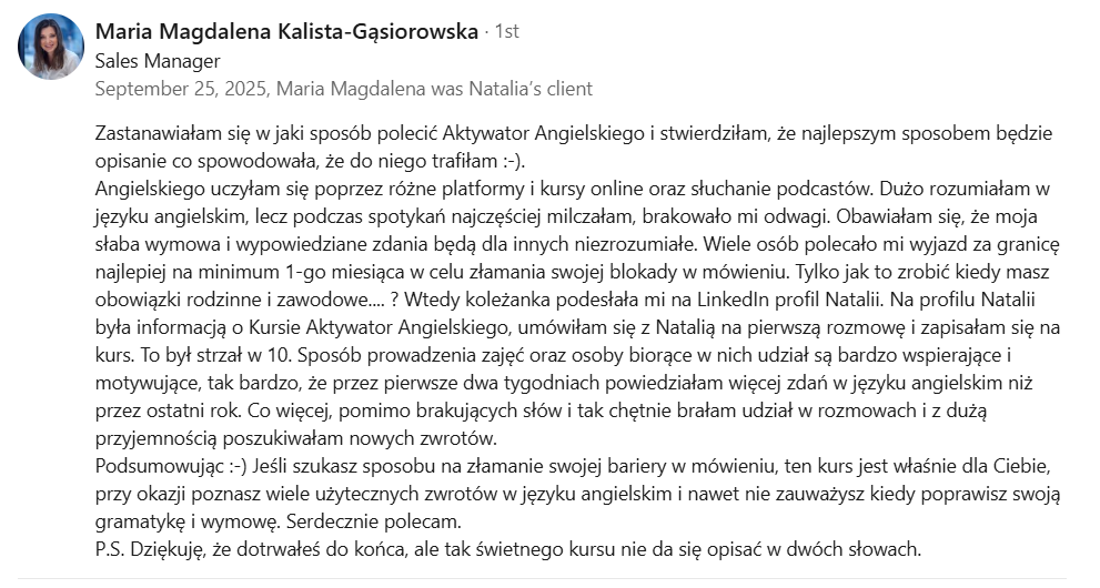 Nazywam się Natalia Kazik i jestem mentorem oraz coachem języka angielskiego. Pomagam osobom takim jak Ty osiągać biegłość w języku angielskim, w krótszym czasie niż się spodziewają. Mój cel to pokazanie, że nauka angielskiego nie musi trwać latami – z odpowiednim podejściem, skupieniem i determinacją, możesz osiągnąć swoje cele znacznie szybciej.