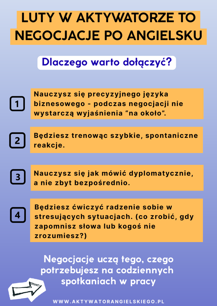 - Skupiamy się na rozwoju umiejętności biznesowych w języku angielskim. Jest to, na przykład, prezentowanie pomysłów, prowadzenie spotkań, negocjowanie oraz branie udziału w dyskusji.